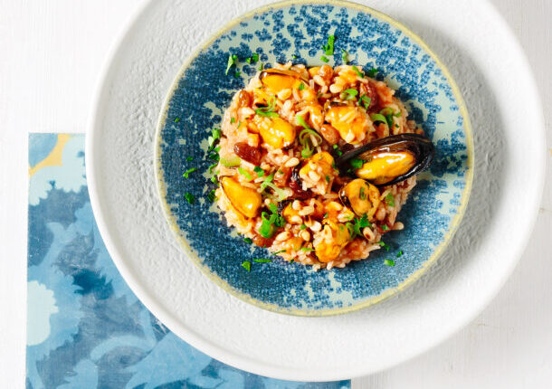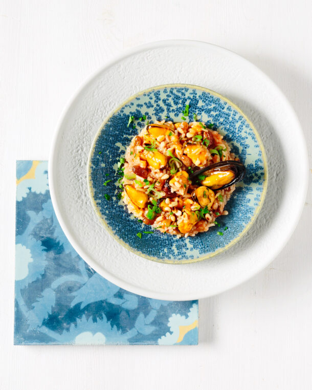 - Σερβίρουμε σε πιατέλα ή στα πιάτα στρώνοντας από πάνω τα ολόκληρα μύδια και πασπαλίζοντας με τα ψιλοκομμένα φύλλα μαϊντανού.