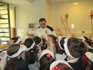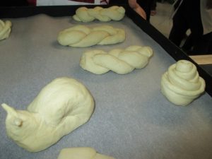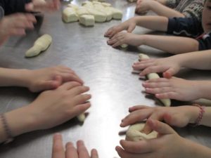 Αφού φόρεσαν τα καπελάκια και τις ποδίτσες που με μεγάλη χαρά τους χάρισαν, έπιασαν δουλειά… Μέτρησαν τα υλικά και τα έβαλαν στο μεγάλο μίξερ να ζυμωθεί και μετά έφτασε η μεγάλη στιγμή (!!!). Η στιγμή που πήραν στα χέρια τους τη ζύμη για να φτιάξουν τα δικά τους ψωμάκια. Εκεί ξεδίπλωσαν την αστείρευτη φαντασία και τη δημιουργικότητά τους. Έφτιαξαν ψωμάκια σε απίθανα σχέδια… Πλεξούδες, μαργαρίτες, σαλιγκαράκια κι ολοστρόγγυλα ψωμάκια τοποθετήθηκαν προσεκτικά στις λαμαρίνες για να μπουν στο φούρνο. Και μετά ο τόπος μοσχομύρισε και η χαρά «ξεχείλισε» από τις παιδικές καρδιές όταν πήραν στα χέρια τους τα δικά τους ψωμάκια.