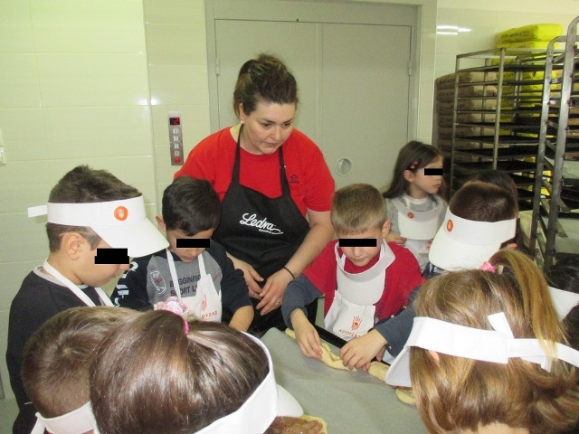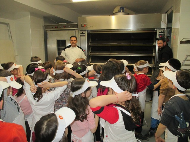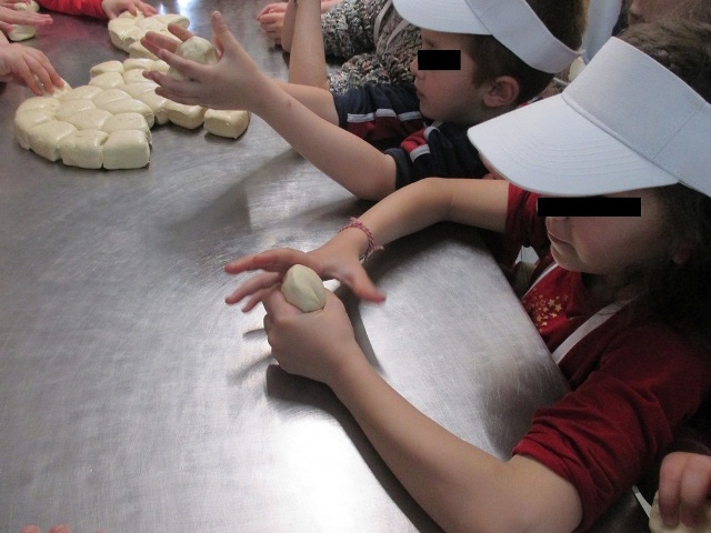 Αφού φόρεσαν τα καπελάκια και τις ποδίτσες που με μεγάλη χαρά τους χάρισαν, έπιασαν δουλειά… Μέτρησαν τα υλικά και τα έβαλαν στο μεγάλο μίξερ να ζυμωθεί και μετά έφτασε η μεγάλη στιγμή (!!!). Η στιγμή που πήραν στα χέρια τους τη ζύμη για να φτιάξουν τα δικά τους ψωμάκια. Εκεί ξεδίπλωσαν την αστείρευτη φαντασία και τη δημιουργικότητά τους. Έφτιαξαν ψωμάκια σε απίθανα σχέδια… Πλεξούδες, μαργαρίτες, σαλιγκαράκια κι ολοστρόγγυλα ψωμάκια τοποθετήθηκαν προσεκτικά στις λαμαρίνες για να μπουν στο φούρνο. Και μετά ο τόπος μοσχομύρισε και η χαρά «ξεχείλισε» από τις παιδικές καρδιές όταν πήραν στα χέρια τους τα δικά τους ψωμάκια.