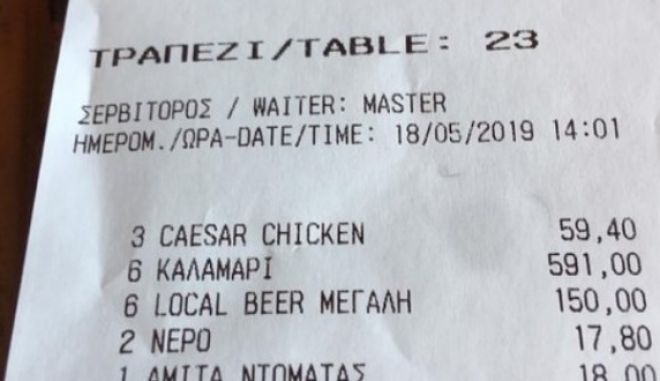 Τουρίστας από τις ΗΠΑ πλήρωσε σε εστιατόριο της Μυκόνου 59,40 ευρώ για τρεις σαλάτες σίζαρ, 591 για έξι μερίδες καλαμάρια, 150 για έξι “τοπικές μεγάλες μπύρες”, 17,8 για δύο μπουκάλια νερού και 18 ευρώ για χυμό. Το μαγαζί είναι παραθαλάσσιο εστιατόριο του νησιού, στην παραλία Πλατύς Γυαλός.
