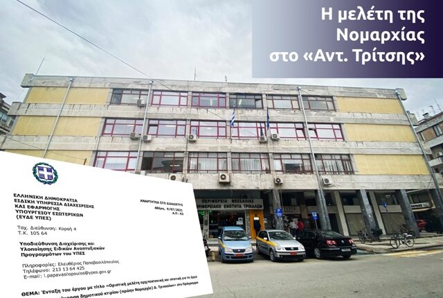 Ακόμη ένα βήμα για να αλλάξει μορφή και χρήση το κτήριο της πρώην Νομαρχίας, έκανε ο Δήμος Τρικκαίων. Την Παρασκευή 9 Ιουλίου 2021 η Ειδική Υπηρεσία Διαχείρισης και Εφαρμογής του Υπουργείου Εσωτερικών (ΕΥΔΕ ΥΠΕΣ) με υπογραφή του αν. Υπουργού Εσωτερικών Στ. Πέτσα, ενέταξε τη μελέτη για το έργο στον άξονα «Πολιτική Προστασία – Προστασία της Δημόσιας Υγείας-Τεχνική Βοήθεια», του Προγράμματος «ΑΝΤΩΝΗΣ ΤΡΙΤΣΗΣ».