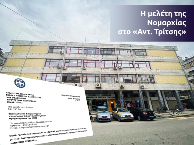 Ακόμη ένα βήμα για να αλλάξει μορφή και χρήση το κτήριο της πρώην Νομαρχίας, έκανε ο Δήμος Τρικκαίων. Την Παρασκευή 9 Ιουλίου 2021 η Ειδική Υπηρεσία Διαχείρισης και Εφαρμογής του Υπουργείου Εσωτερικών (ΕΥΔΕ ΥΠΕΣ) με υπογραφή του αν. Υπουργού Εσωτερικών Στ. Πέτσα, ενέταξε τη μελέτη για το έργο στον άξονα «Πολιτική Προστασία – Προστασία της Δημόσιας Υγείας-Τεχνική Βοήθεια», του Προγράμματος «ΑΝΤΩΝΗΣ ΤΡΙΤΣΗΣ».