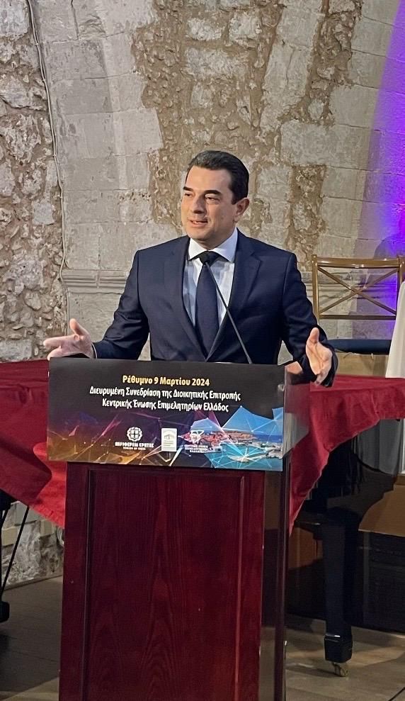 Ο Υπουργός Ανάπτυξης Κώστας Σκρέκας, συνοδευόμενος και από τον Υφυπουργό Ανάπτυξης Μάξιμο Σενετάκη, συμμετείχε το Σάββατο 9 Μαρτίου στη διευρυμένη συνεδρίαση της διοικητικής επιτροπής της Κεντρικής Ένωσης Επιμελητηρίων Ελλάδας στο Ρέθυμνο, εκπροσωπώντας τον Πρωθυπουργό Κυριάκο Μητσοτάκη.