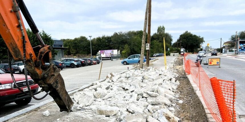 δεξιά πλευρά της οδού Καρδίτσης, όπου κατασκευάζονται νέα πεζοδρόμια για τους πολίτες.