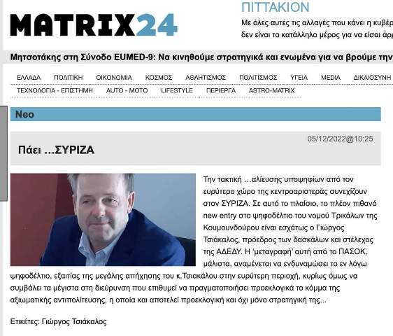 trikaladay.gr / Παραπολιτικά / Νέο δημοσίευμα αθηναϊκού ΜΜΕ για την υποψηφιότητα του Τρικαλινού εκπαιδευτικού Γιώργου Τσιάκαλου
