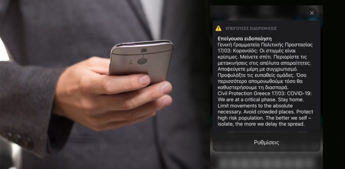 Επείγουσα ειδοποίηση έστειλε στα κινητά των πολιτών η Γενική Γραμματεία Πολιτικής Προστασίας για τον κορωνοϊό, ζητώντας από τους πολίτες να μείνουν στο σπίτι καθώς «οι στιγμές είναι κρίσιμες».