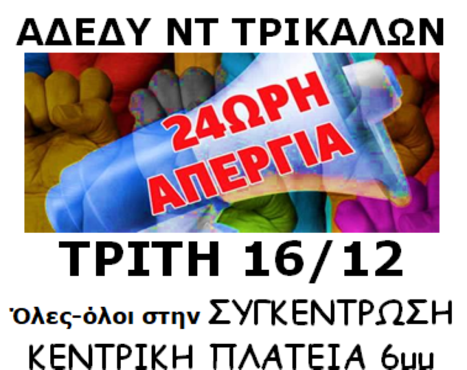 όλους/ες τους/τις Τρικαλινούς/ες να συμμετέχουν μαζικά στην ΑΠΕΡΓΙΑ και στην ΑΠΕΡΓΙΑΚΗ
