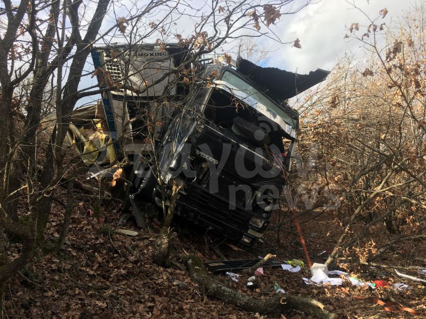 Νταλίκα με ελληνικές πινακίδες που μετέφερε κοτόπουλα κινούμενη με κατεύθυνση προς την Καλαμπάκα, για άγνωστη αιτία, ο οδηγός της έχασε τον έλεγχο με αποτέλεσμα να βγει εκτός δρόμου και να πέσει σε γκρεμό.