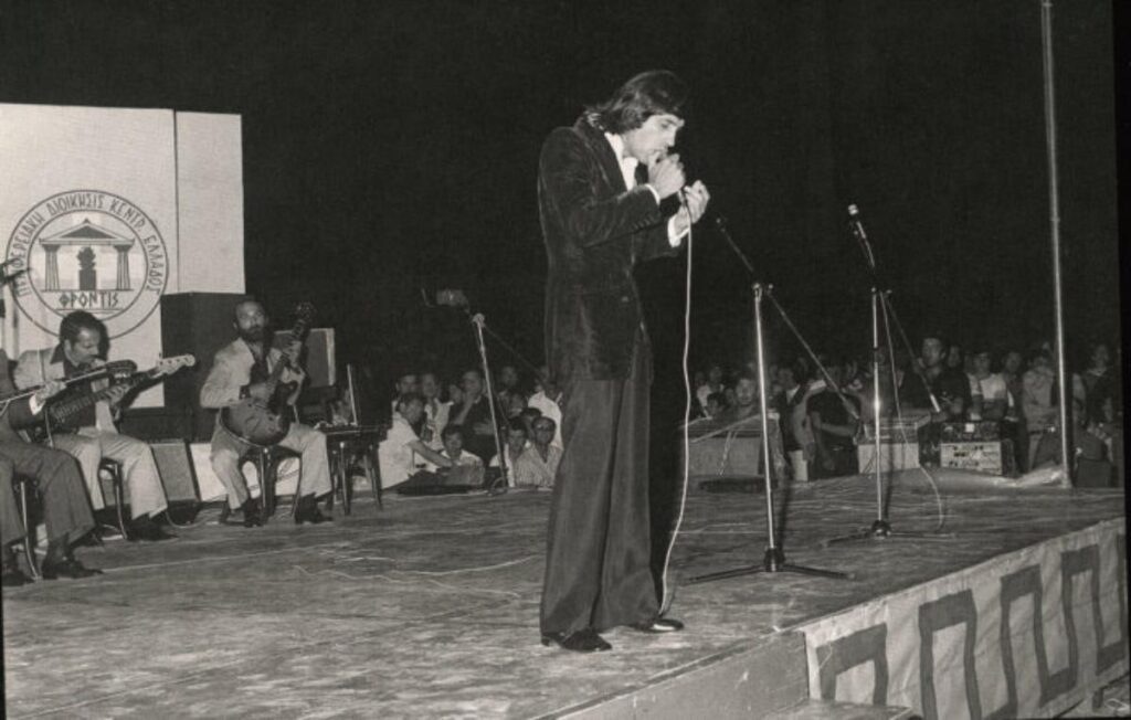 Η φωτογραφία προέρχεται από το φωτογραφικό άλμπουμ του Τάκη Πανανίδη «Αυτόπτης φωτομάρτυρας στην Οδό Ονείρων», εκδόσεις Τόπος. Ολόκληρη η ελληνική καλλιτεχνική σκηνή (λαϊκή και έντεχνη) παρελάυνει σε αποκαλυπτικές εικόνες. Έχει πολλά ντοκουμέντα ο πολύτιμος αυτός τόμος, όμως το ντοκουμέντο που παρουσιάζουμε σήμερα είναι το πιο ερεθιστικό και αποκαλυπτικό από όλα.