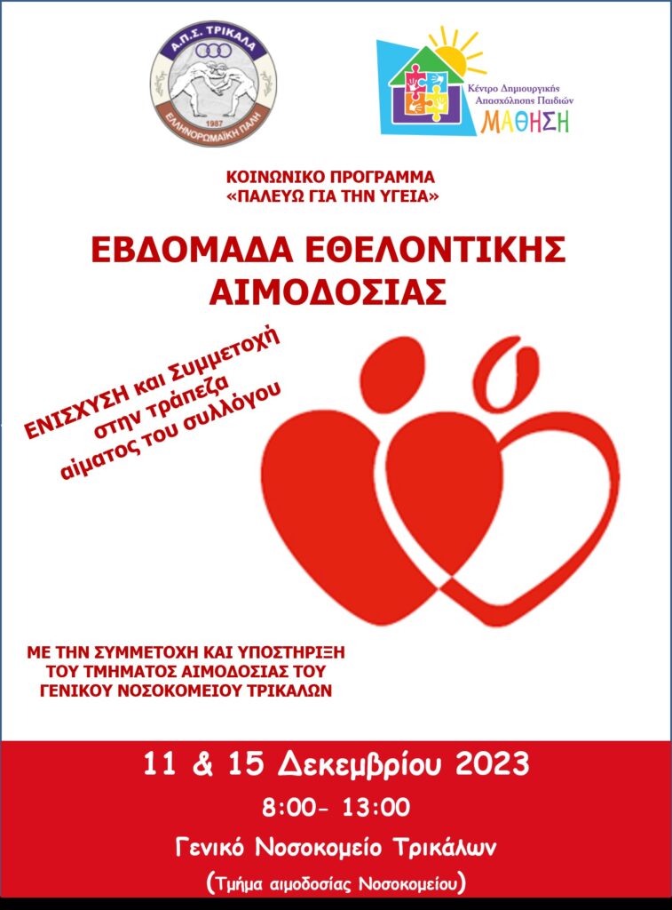 Αναλυτικά, το πρόγραμμα εθελοντικής αιμοδοσίας που σχεδίασε ο ΑΠΣ Τρίκαλα- Ελληνορωμαϊκή Πάλη