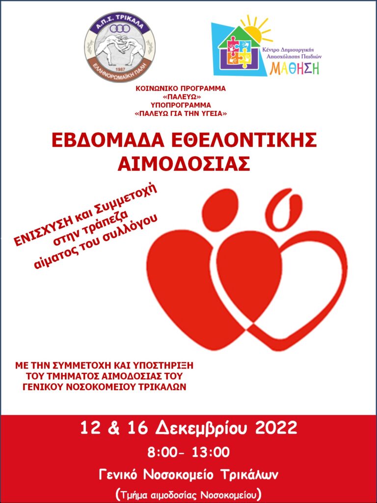 Αναλυτικά, το πρόγραμμα εθελοντικής αιμοδοσίας που σχεδίασε ο ΑΠΣ Τρίκαλα- Ελληνορωμαϊκή Πάλη και το τμήμα Αιμοδοσίας του Γ.Ν.Τ., είναι: