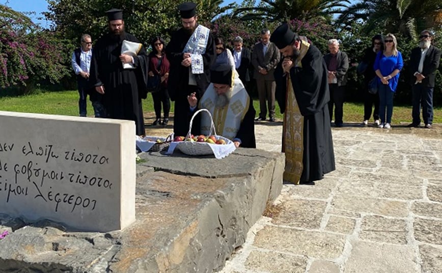 Το τρισάγιο τελέστηκε από τον Αρχιεπίσκοπο Κρήτης κ.κ. Ευγένιο, ο οποίος αποτίνοντας τιμές στον κορυφαίο Κρητικό λογοτέχνη γονάτισε μπροστά στο λιτό μνημείο του, προκαλώντας έντονη συγκίνηση στους παρισταμένους, όπως αναφέρει το cretalive.