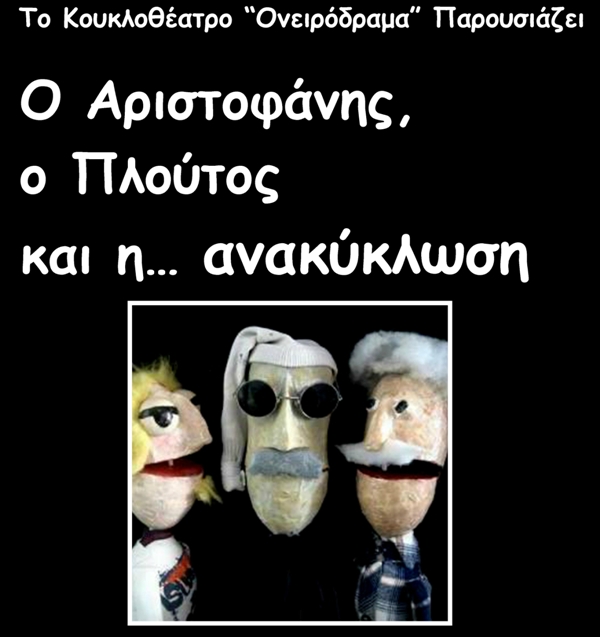 Αυτό το Σάββατο 23 Ιανουαρίου, το Μεταθέατρο Κέντρο Τέχνης, (Κεντρική Πλατεία-Πάνω από το Καφέ Μικέλ – Α΄Όροφος) σας δίνει την ευκαιρία μέσα από τη σκηνή του «Κουκλοθέατρο Ονειρόδραμα» να παρακολουθήσετε την παράσταση «Ο ΑΡΙΣΤΟΦΑΝΗΣ, Ο ΠΛΟΥΤΟΣ ΚΑΙ Η…ΑΝΑΚΥΚΛΩΣΗ».