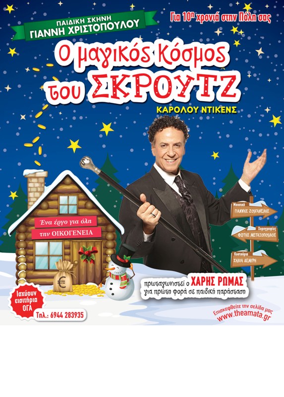 Η παιδική σκηνή του ΓΙΑΝΝΗ ΧΡΙΣΤΟΠΟΥΛΟΥ που επισκέπτεται φέτος την Πόλη σας για 10η συνεχή χρονιά, με ιδιαίτερη χαρά παρουσιάζει φέτος τον καταξιωμένο μας ηθοποιό ΧΑΡΗ ΡΩΜΑ! στο γνωστό έργο του ΚΑΡΟΛΟΥ ΝΤΙΚΕΝΣ “Ο ΜΑΓΙΚΟΣ ΚΟΣΜΟΣ ΤΟΥ ΣΚΡΟΥΤΖ”