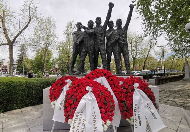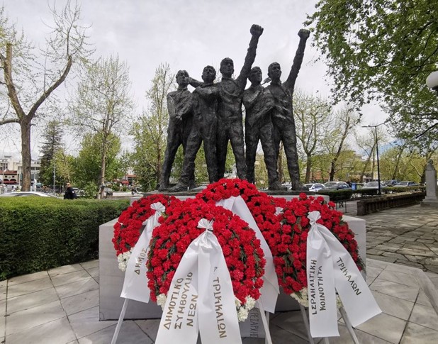Τρίτη του Πάσχα το 1944, Τρίτη του Πάσχα και το 2023. Τότε οι Γερμανοί κατακτητές απαγχόνισαν τους 5 ΕΠΟΝίτες των Τρικάλων, τώρα τιμήθηκε από τον Δήμο Τρικκαίων η θυσία τους. Το πρωί της 18ης Απριλίου 2023 στην πλατεία ρήγα Φεραίου – τόπο της εκτέλεσης – ο Δήμος Τρικκαίων διοργάνωσε την τιμητική εκδήλωση μνήμης για τους 5 ΕΠΟΝίτες. Οι Στέργιος Γάτσας, Γιάννης Μπριάζης, Κώστας Στεργιόπουλος, Κώστας Σύρμπας – και αφού η αγχόνη είχε προηγουμένως σπάσει, αλλά οι συνεργάτες των Γερμανών επέμεναν – και Αποστόλης Τσανάκας οδηγήθηκαν στην αγχόνη, μετά την επιχείρηση των κατακτητών στην περιοχή Κόκκινού Πύργου και αφού είχε σχεδιαστεί επιχείρηση του εφεδρικού ΕΛΑΣ στα Τρίκαλα, επιχείρηση που φαίνεται ότι προδόθηκε. Υπενθυμίζεται ότι ο Κώστας Σύρμπας απαγχονίστηκε, αφού έσπασε για πρώτη φορά η αγχόνη και ο Ελληνας συνεργάτης.