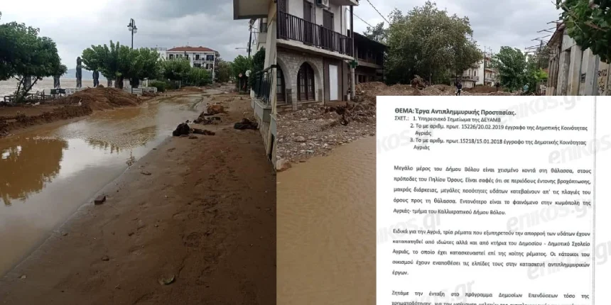 Το enikos.gr αποκαλύπτει σήμερα τα έγγραφα που είχε αποστείλει ο Δήμος Βόλου από το 2018, «χτυπώντας καμπανάκι» ιδίως για την Αγριά, όπου το Δημοτικό Σχολείο, όπως είχε ενημερώσει ο κ. Μπέος, έχει κατασκευαστεί επί κοίτης ρέματος. Σημειώνεται ότι το πέρασμα της κακοκαιρίας Daniel από τον Βόλο και την συγκεκριμένη συνοικία ήταν καταστροφικό. Δρόμοι έγιναν λίμνες, ενώ τα ορμητικά νερά μπήκαν σε σπίτια και προκάλεσαν σοβαρές ζημιές.