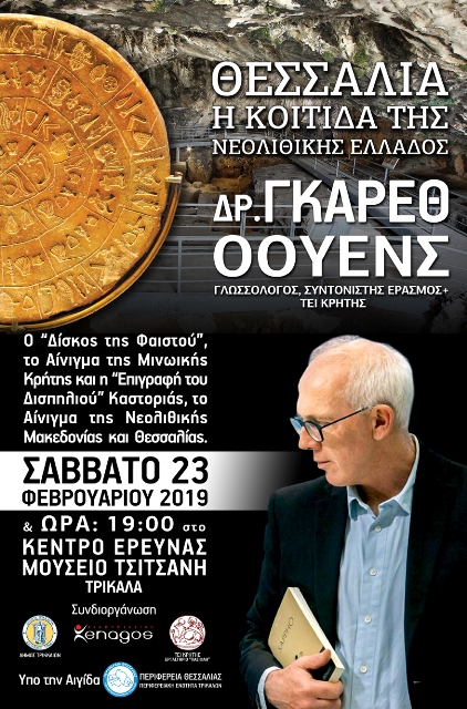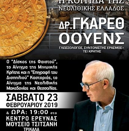 Ο Δήμος Τρικκαίων και η Περιφέρεια Θεσσαλίας σε συνεργασία με το ΤΕΙ Κρήτης διοργανώνουν το Σάββατο 23 Φεβρουαρίου 2019 (19.00) στο Κέντρο Έρευνας Μουσείο Τσιτσάνη μια εκδήλωση που έχει ως στόχο να «αποκαλύψει» τα μυστικά του Δίσκου της Φαιστού και της επιγραφής του Δισπηλιού Καστοριάς: το Αίνιγμα της Νεολιθικής Μακεδονίας και Θεσσαλίας. Το θέμα της διάλεξης είναι «ΘΕΣΣΑΛΙΑ – Η ΚΟΙΤΙΔΑ ΤΗΣ ΝΕΟΛΙΘΙΚΗΣ ΕΛΛΑΔΟΣ». Ο «Δίσκος της Φαιστού»: το Αίνιγμα της Μινωικής Κρήτης και η «Επιγραφή του Δισπηλιού» Καστοριάς το Αίνιγμα της Νεολιθικής Μακεδονίας και Θεσσαλίας. Τη διάλεξη θα δώσει ο ελληνοβρετανός καθηγητής – μελετητής Δρ. Γκάρεθ Όουενς, ειδικός στο θέμα της δίσκου της Φαιστού.