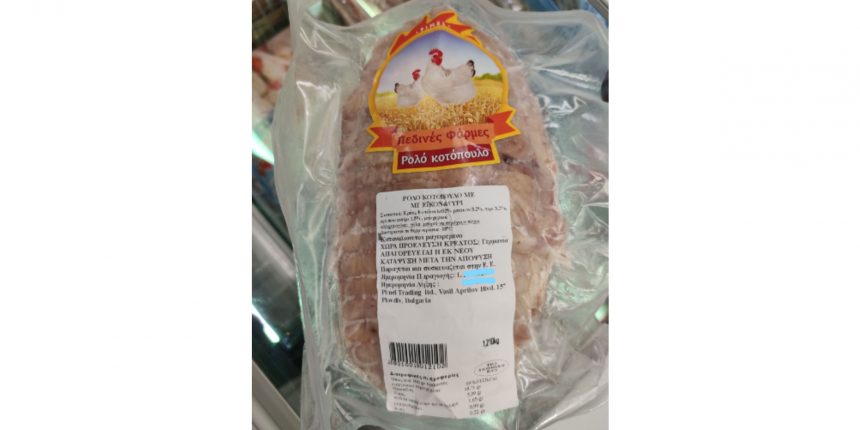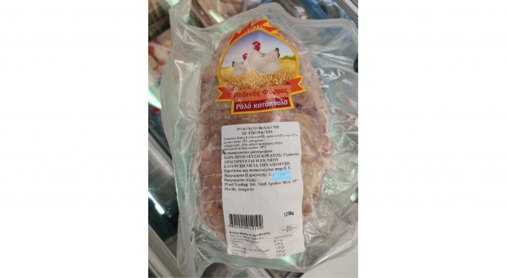 Η Περιφερειακή Διεύθυνση Ηπείρου του ΕΦΕΤ, κατά τη διενέργεια ελέγχων, πήρε δείγμα κατεψυγμένου παρασκευάσματος από κρέας πουλερικών που προορίζεται να καταναλωθεί μαγειρεμένο και διανέμεται από την εταιρεία ΜΕΤΡΟ Α.Ε.Β.Ε. (υποκατάστημα MyMarket), με την εμπορική ονομασία “ΠΕΔΙΝΕΣ ΦΑΡΜΕΣ ΡΟΛΟ ΚΟΤΟΠΟΥΛΟ ΜΕ ΜΠΕΪΚΟΝ ΚΑΙ ΤΥΡΙ” με ημερομηνία παραγωγής 18/11/19 και ημερομηνία λήξης 18/11/20, το οποίο παράγεται και συσκευάζεται στην Ε.Ε. από την εταιρεία Pimel Trading ltd., Vasil Aprilov Blvd. 157, Plovdiv, Βουλγαρία.