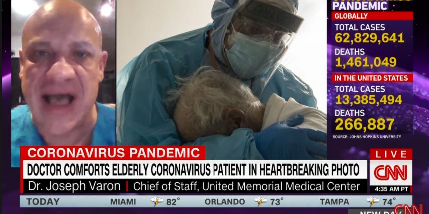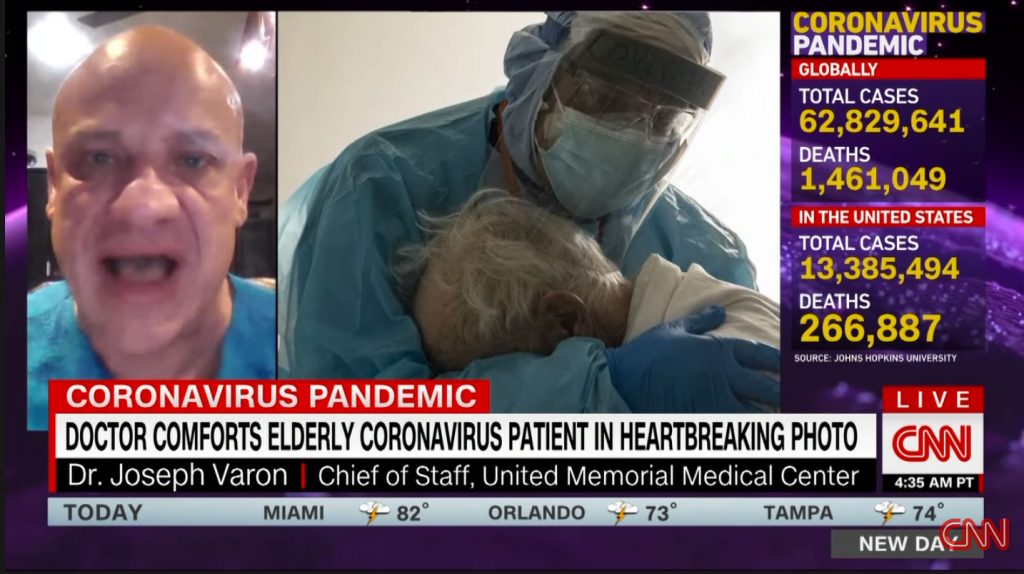 «Ήμουν στη μονάδα COVID και είδα αυτόν τον ηλικιωμένο ασθενή, που είχε σηκωθεί από το κρεβάτι του, προσπαθούσε να φύγει κι είχε αρχίσει να κλαίει», αφηγήθηκε στο CNN ο γιατρός Τζόζεφ Βαρόν, επικεφαλής του τμήματος εντατικής θεραπείας στο United Memorial. «Πλησίασα και τον ρώτησα “γιατί κλαίτε;”. Μου είπε: “θέλω να είμαι με τη γυναίκα μου”. Τον αγκάλιασα», εξήγησε ο γιατρός, προσθέτοντας πως δεν λογάριαζε ότι τον φωτογράφιζαν.