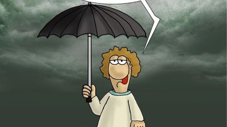 Στο σκίτσο που αναρτήθηκε στη σελίδα του στο Facebook εμφανίζεται ο Ιούνιος ο οποίος ζητά την κατανόηση των ανθρώπων για την κακοκαιρία.