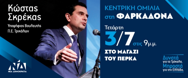 Ο Υποψήφιος Βουλευτής Τρικάλων της Ν.Δ. και Πρώην Υπουργός, ο άνθρωπος των έργων και των πράξεων, θα μιλήσει την Τετάρτη 3 Ιουλίου στις 9 μ.μ. στη Φαρκαδόνα στο ΘΕΣΣΑΛΙΑ ΠΑΛΛΑΣ (μαγαζί του ΠΕΡΚΑ).