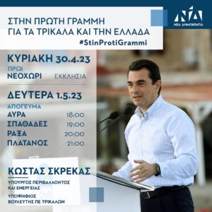 Ο Υπουργός Περιβάλλοντος και Ενέργειας και υποψήφιος βουλευτής Π.Ε. Τρικάλων, Κώστας Σκρέκας, την Κυριακή 30 Απριλίου το πρωί και τη Δευτέρα 1 Μαΐου το απόγευμα, θα επισκεφθεί τα ακόλουθα χωριά: