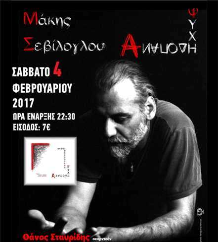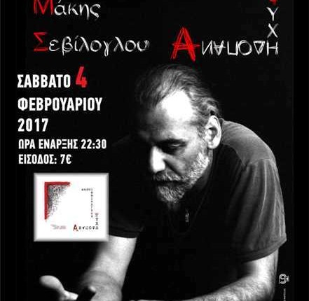Ο Μάκης Σεβίλογλου παρουσιάζει ένα μουσικό πρόγραμμα με τίτλο, δανεισμένο από την καινούρια του δισκογραφική δουλειά, «Ανάποδη Ψυχή» όπου συμμετέχουν ο Βασίλης Καρράς, ο Σόλων Λέκκας κι η Χρύσα Μωραϊτη. Ακούγονται τραγούδια από τους προσωπικούς του δίσκους, «Γλυκό μεθύσι», «Άγκυρες», «Παράθυρο ανοιχτό» και την καινούρια του δισκογραφική δουλειά «Ανάποδη Ψυχή».Τραγούδια που γνωρίσαμε από τον ίδιο, αλλά και από τις συνεργασίες του με τη Χάρις Αλεξίου, Δημ. Μητροπάνο, Πίτσα Παπαδοπούλου, Βασίλη Καρρά κ.α. καθώς και ανέκδοτα τραγούδια αλλά και γνωστές, αγαπημένες μελωδίες, άλλων αγαπημένων δημιουργών της ελληνικής μουσικής σκηνής, κάνοντας ένα μεγάλο μουσικό περίπατο, «Απ’ τα καινούρια στα παλιά κι ανάποδα» Ο Μάκης Σεβίλογλου παρέα με τον Θάνο Σταυρίδη στο ακορντεόν, Μάριο Μακρή στην ακουστική κιθάρα , Δημήτρη Κίτσιο στο κοντραμπάσοκαι Μιχάλη Παναγούλα στο κλαρίνο, μας προσκαλούν σε ξεχωριστά μουσικά μονοπάτια, να τραγουδήσουμε, ν’ αγκαλιαστούμε να αφεθούμε σε μελωδίες και ρυθμούς.