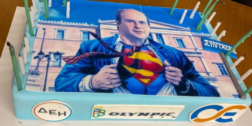 Η σύζυγός του και οι συνεργάτες του κ. Χατζηδάκη του ετοίμασαν μια τούρτα, η οποία απεικόνιζε τον τον ίδιο σε ρόλο… σούπερμαν. Είχε επίσης τα σήματα της ΔΕΗ, του ΟΣΕ και της Ολυμπιακής, δηλαδή μερικά από τα καυτά θέματα που αντιμετώπισε στην πολιτική του διαδρομή ως υπουργός. Ξεχώριζε, επίσης, η λέξη «Συντάξεις», θέμα με το οποίο καταπιάνεται στο υπουργείο Εργασίας.