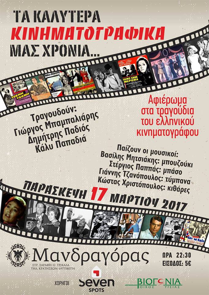 Ένα μοναδικό αφιέρωμα στα τραγούδια του ελληνικού κινηματογράφου, μέσα από αγαπημένες ασπρόμαυρες και έγχρωμες ελληνικές ταινίες που όλοι έχουμε δει και έχουμε αγαπήσει. Τα τραγούδια ερμηνεύουν οι :Γιώργος Μπαμπαλιάρης, Δημήτρης Παδιός, Κάλυ Παπαδιά.Παίζουν οι μουσικοί:Βασίλης Μητσιάκης (μπουζούκι), Στέργιος Παππάς (μπάσο), Γιάννης Τζανόπουλος (τύμπανα), Κώστας Χριστόπουλος (κιθάρες-φωνητικά).