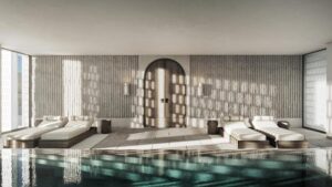 αίθουσες θεραπείας για μασάζ, μία αίθουσα υδρογονοθεραπείας, ένα χαμάμ και μία εσωτερική πισίνα,