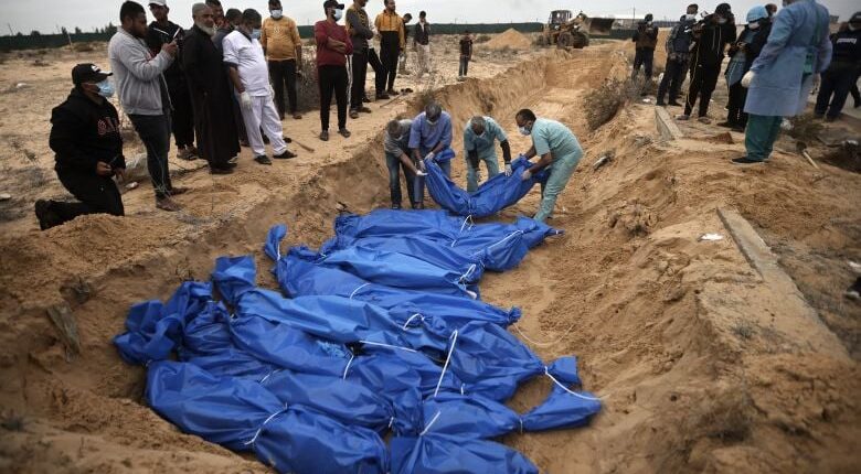 Οι παλαιστινιακές αρχές ανέφεραν αυτή την εβδομάδα ότι εντόπισαν εκατοντάδες πτώματα σε ομαδικούς τάφους στο νοσοκομείο Νάσερ, τη βασική ιατρική μονάδα στην κεντρική Λωρίδα της Γάζας, αφότου τα ισραηλινά στρατεύματα αποχώρησαν από την πόλη Χαν Γιούνις. Υπήρξαν επίσης αναφορές ότι εντοπίστηκαν πτώματα στο νοσοκομείο Αλ Σίφα στη βόρεια Γάζα, που έχει αποτελέσει στόχο σε επιχείρηση των ισραηλινών ειδικών δυνάμεων.