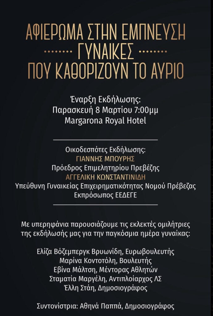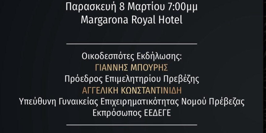 Η εκδήλωση του Επιμελητηρίου Πρέβεζας θα λάβει χώρα στο Margarona Royal Hotel, ώρα 19:00 με τη φροντίδα και την οργάνωση του Προέδρου του, κ. Μπούρη και της κας Κωνσταντινίδη, υπεύθυνη γυναικείας επιχειρηματικότητας.