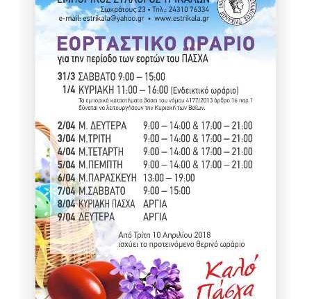 Ο Εμπορικός Σύλλογος Τρικάλων ενημερώνει τους συναδέλφους και το καταναλωτικό κοινό ότι το προτεινόμενο εορταστικό ωράριο των καταστημάτων για την περίοδο του Πάσχα, από το Σάββατο 31 Μαρτίου 2018 έως την Δευτέρα 9 Απριλίου 2018, έχει ως εξής: