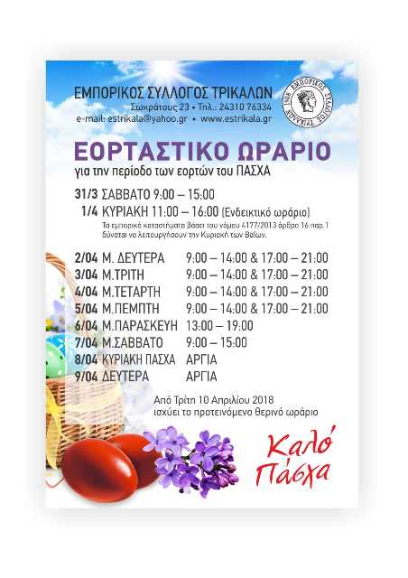 Ο Εμπορικός Σύλλογος Τρικάλων ενημερώνει τους συναδέλφους και το καταναλωτικό κοινό ότι το προτεινόμενο εορταστικό ωράριο των καταστημάτων για την περίοδο του Πάσχα, από το Σάββατο 31 Μαρτίου 2018 έως την Δευτέρα 9 Απριλίου 2018, έχει ως εξής: