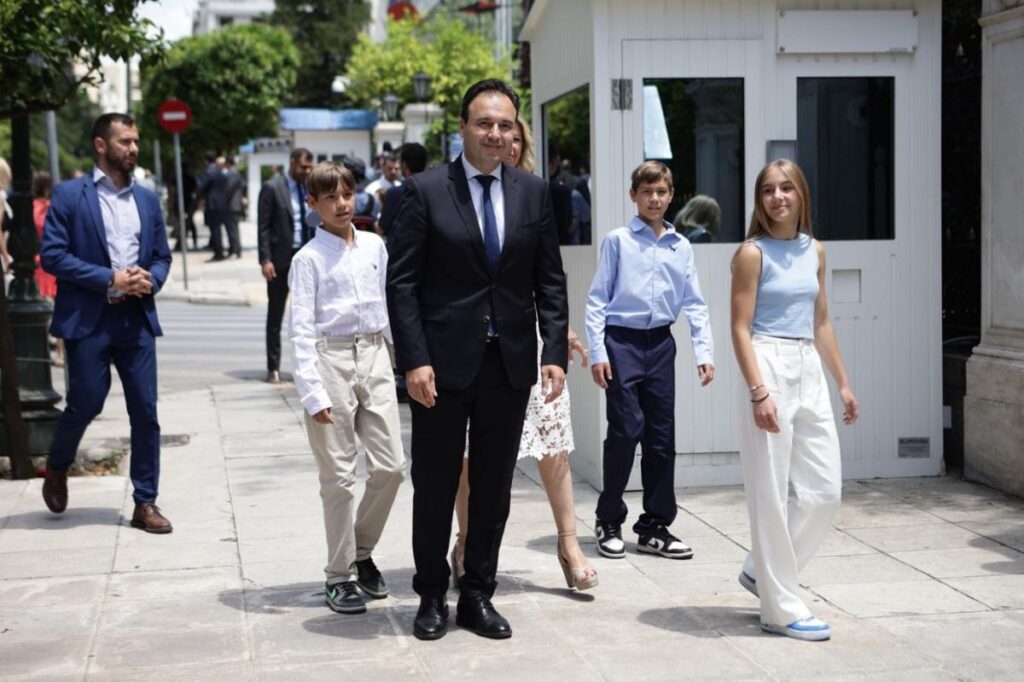 Στο Προεδρικό Μέγαρο προσήλθαν και οι Τρικαλινοί υπουργοί, ο Κ. Σκρέκας συνοδεύομενος από τη σύζυγο του Ειρήνη και ο Δημ. Παπαστεργίου με τη σύζυγό του Σούλα Μπράκη και τα τρια τους παιδιά