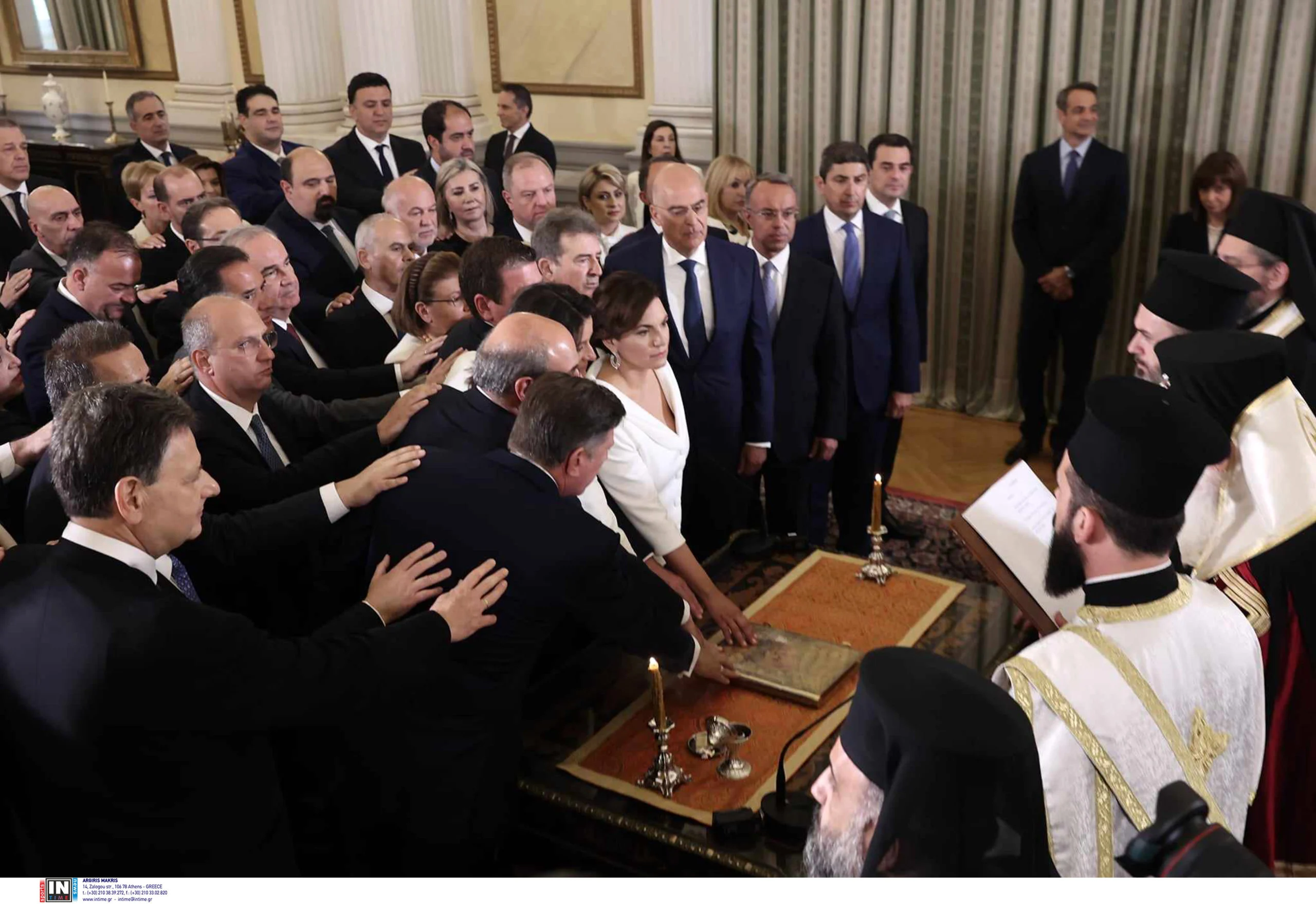 Ενώπιον της Προέδρου της Δημοκρατίας Κατερίνας Σακελλαροπούλου και παρουσία του πρωθυπουργού Κυριάκου Μητσοτάκη, ορκίστηκαν πριν από λίγο από τον αρχιεπίσκοπο Αθηνών και πάσης Ελλάδος Ιερώνυμο, τα μέλη της νέας κυβέρνησης.