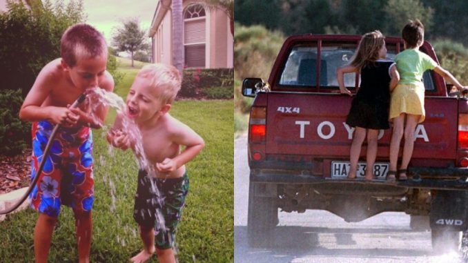 Εντάξει, τρομακτικό. Και τώρα καταλαβαίνω τη γιαγιά μου, που κάθε φορά μου έλεγε «σε φυλάει άγιος με αυτά που κάνεις». Αλλά για να είμαι ειλικρινής, αυτές τις στιγμές που πλέον είναι γλυκές αναμνήσεις, δεν τις αλλάζω με τίποτα. Και αισθάνομαι τυχερή που μεγάλωσα τη δεκαετία του ’80 σε χωριό και συγκεκριμένα στο Κρυονέρι Κορινθίας (να τα λέμε και αυτά). Και όσοι πέρασαν έτσι τα δικά τους παιδικά χρόνια, είμαι σίγουρη πως συμφωνούν. Γιατί, αν δεν έχεις πιει νερό από το λάστιχο και δεν πηγαίνατε όλα τα παιδιά της γειτονιάς για μπάνιο πάνω στην καρότσα του αγροτικού, δεν ανήκεις στο γκρουπ.