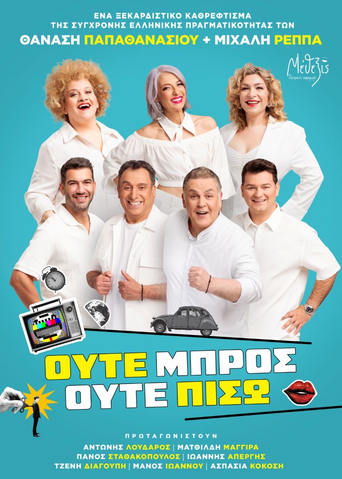 Μετά την τεράστια επιτυχία που γνώρισε στην καλοκαιρινή της περιοδεία, ο Θανάσης Παπαθανασίου και ο Μιχάλης Ρέππας, παρουσιάζουν στα Τρίκαλα την παράσταση, «Ούτε Μπρος ούτε Πίσω», σε παραγωγή Μέθεξις του Χρήστου Τριπόδη. Πρωταγωνιστούν: Αντώνης Λουδάρος, Ματθίλδη Μαγγίρα, Πάνος Σταθακόπουλος, Ιωάννης Απέργης, Τζένη Διαγούπη, Μάνος Ιωάννου, Ασπασία Κοκόση.