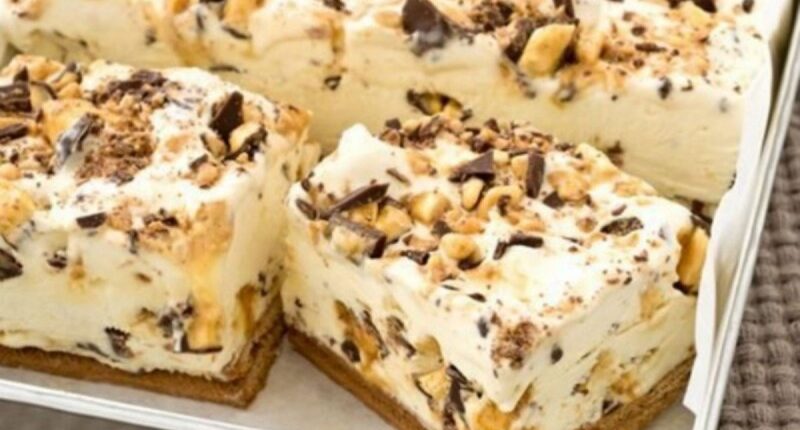 - Τα βάζετε στη κατάψυξη για ένα βράδυ, ή μέχρι να σταθεροποιηθεί και παγώσει καλά το μείγμα. Πριν σερβίρετε βγάζετε το γλυκό σας από τη κατάψυξη το αφήνετε για 10 λ σε θερμοκρασία δωματίου και μετά το κόβετε σε κομμάτια και σερβίρετε.