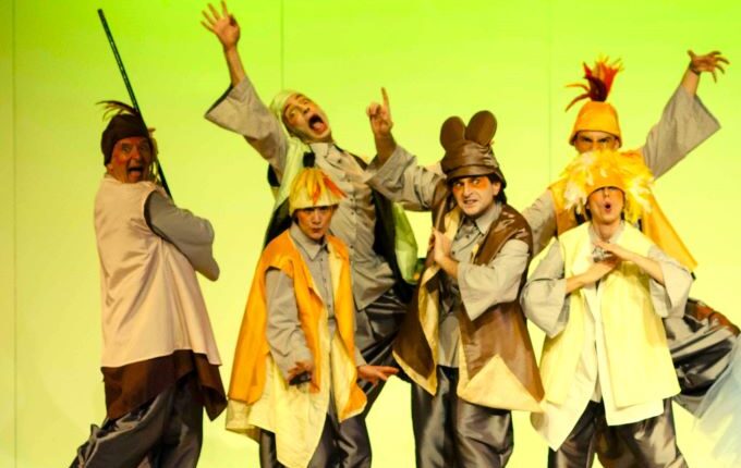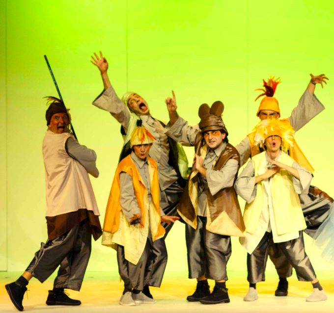 απίστευτα κοστούμια και μουσική από τους ηθοποιούς του θιάσου .