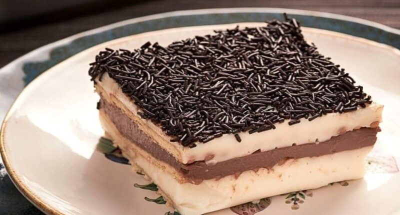 - Αδειάζουμε τη μισή κρέμα βανίλια πάνω στα μπισκότα. Στρώνουμε μπισκότα βουτηγμένα στο γάλα-κονιάκ. Αδειάζουμε σε μία στρώση την κρέμα σοκολάτας.