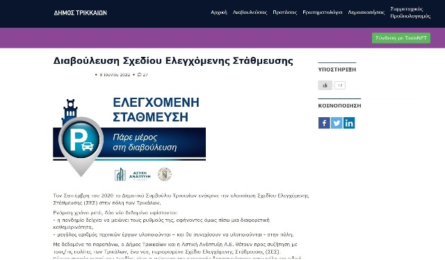 Σε παράταση της διαβούλευσης για τη στάθμευση, λόγω αυξημένου ενδιαφέροντος από τρικαλινούς/ες οδηγήθηκε ο Δήμος Τρικκαίων. Η διαβούλευση παρατείνεται μέχρι και την Τρίτη 21 Ιουνίου 2022, καθώς σταδιακά εκφράζονται περισσότερες γνώμες και υποβάλλονται περισσότερες προτάσεις από πολίτες που ενδιαφέρονται για τα ζητήματα της στάθμευσης, αλλά και γενικότερα για το κυκλοφοριακό.