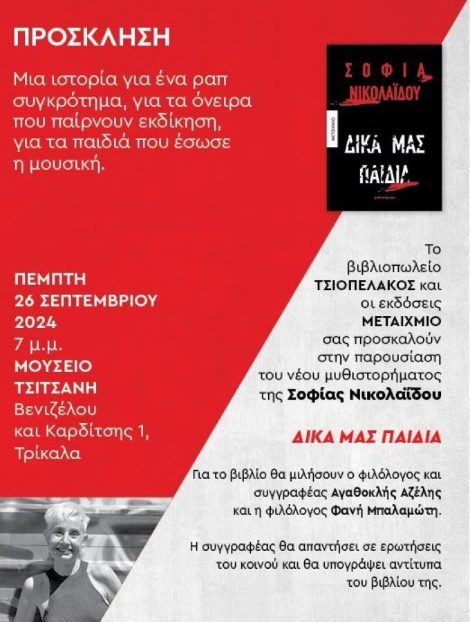 Όσοι μένετε ή βρεθείτε στα Τρίκαλα μη χάσετε την ευκαιρία να συναντήσετε από κοντά τη Σοφία Νικολαΐδου