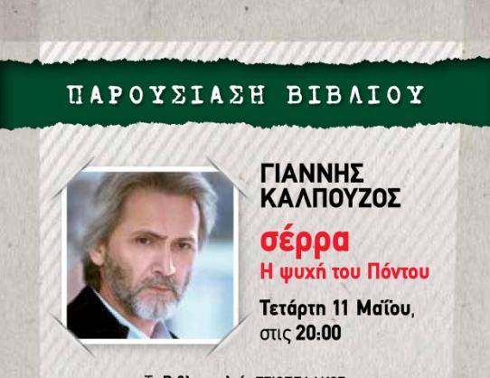 Το Βιβλιοπωλείο ΤΣΙΟΠΕΛΑΚΟΣ (Ασκληπιού 15, Τρίκαλα, τηλ.: 24310 26967), οι Εκδόσεις ΨΥΧΟΓΙΟΣ και η Εύξεινος Λέσχη Τρικάλων σας προσκαλούν στην παρουσίαση του νέου μυθιστορήματος του Γιάννη Καλπούζου “σέρρα Η ψυχή του Πόντου” στο Μουσικό Στέκι «Μανδραγόρας» (Στρατηγού Σαράφη 12, 1ος όροφος, Τρίκαλα).
