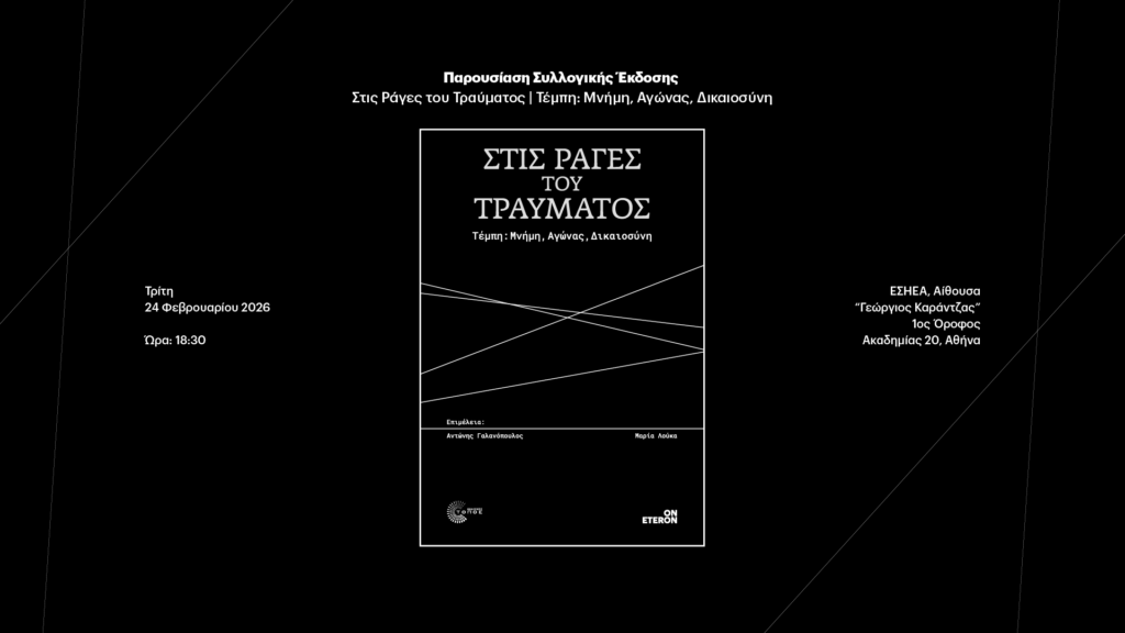 Το Eteron – Ινστιτούτο για την Έρευνα και την Κοινωνική Αλλαγή σε συνεργασία με τις εκδόσεις Τόπος εκδίδουν το βιβλίο «Στις Ράγες του Τραύματος – Τέμπη: Μνήμη, Αγώνας, Δικαιοσύνη».