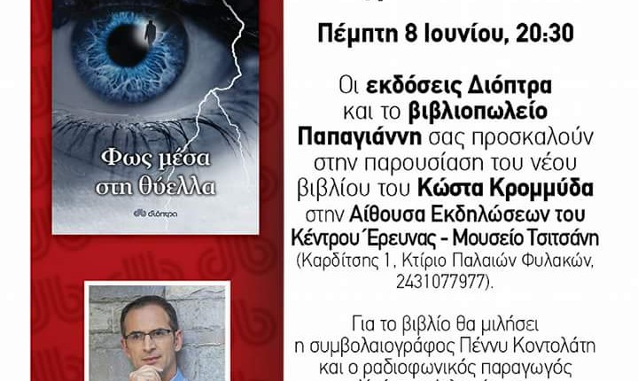 Οι Εκδόσεις Διόπτρα – Dioptra Publications και το Βιβλιοπωλείο Παπαγιάννη διοργανώνουν παρουσίαση του νέου βιβλίου του συγγραφέα ΚΩΣΤΑ ΚΡΟΜΜΥΔΑ στα Τρίκαλα, στον χώρο εκδηλώσεων του Κέντρου Έρευνας – Μουσείο Τσιτσάνη στις 8 Ιουνίου στις 20:30.