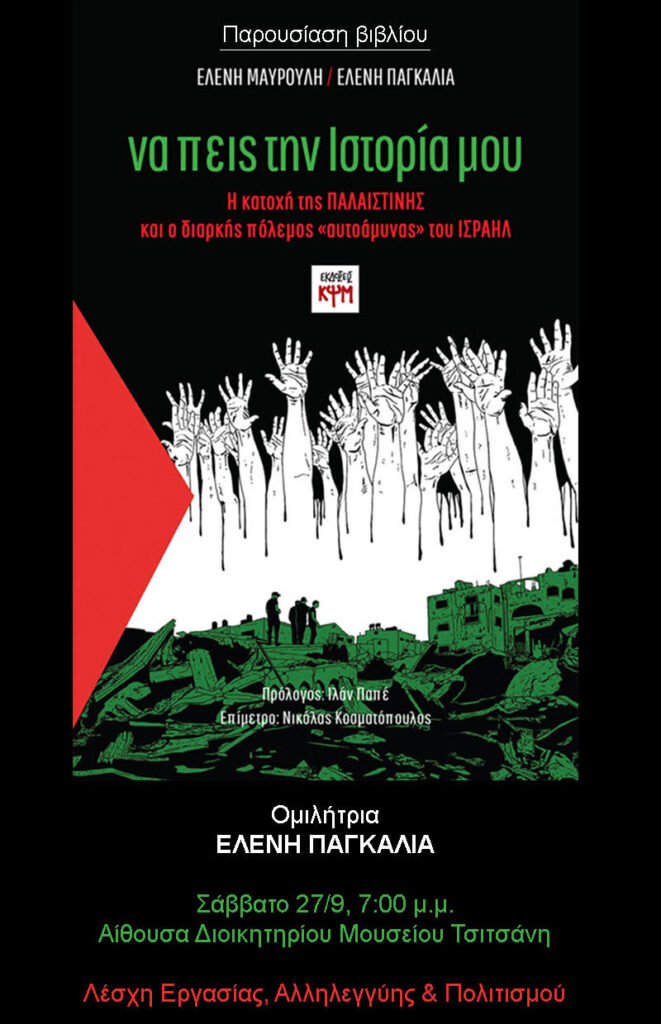 Το Σάββατο 27 Σεπτεμβρίου στις 7:00 μ.μ. στην αίθουσα Διοικητηρίου Μουσείου Τσιτσάνη (πρώην Φυλακές Τρικάλων), η Λέσχη Εργασίας Αλληλεγγύης και Πολιτισμού παρουσιάζει το βιβλίο των Ελένη Μαυρούλη και Ελένη Παγκαλιά με τίτλο να πεις την Ιστορία μου: Η κατοχή της Παλαιστίνης και ο διαρκής πόλεμος «αυτοάμυνας» του Ισραήλ (εκδ ΚΨΜ).