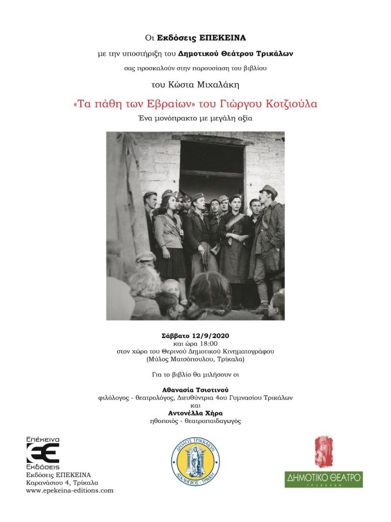 Οι Εκδόσεις ΕΠΕΚΕΙΝΑ με την υποστήριξη του Δημοτικού Θεάτρου Τρικάλων σας προσκαλούν στην παρουσίαση του βιβλίου του Κώστα Μιχαλάκη «Τα πάθη των Εβραίων» του Γιώργου Κοτζιούλα. Ένα μονόπρακτο με μεγάλη αξία.