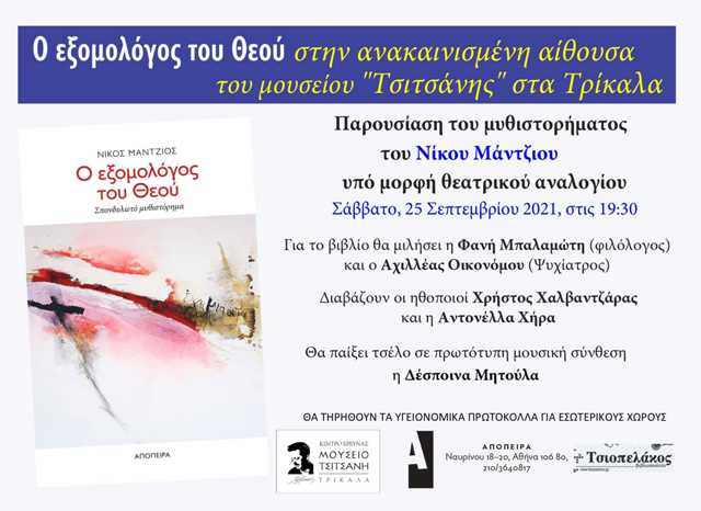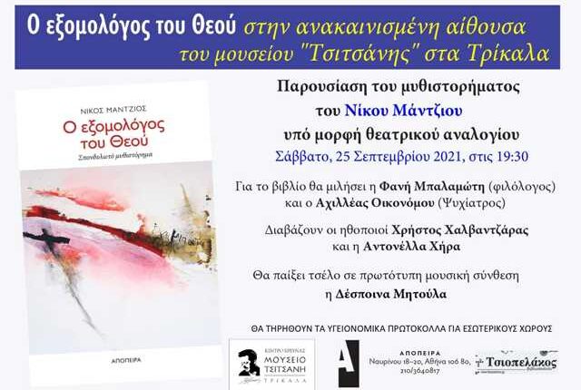 Παρουσίαση του βιβλίου “Ο Εξομολόγος Του Θεού” του Νίκου Μάντζιου, από τις εκδόσεις Απόπειρα, στη νέα ανακαινισμένη αίθουσα του Μουσείου Τσιτσάνης, υπό μορφή θεατρικού αναλογίου.