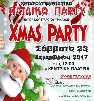 Ο Εμπορικός Σύλλογος Τρικάλων προσκαλεί μικρά και μεγάλα παιδιά στην Χριστουγεννιάτικη εκδήλωση που διοργανώνει για 4η συνεχόμενη χρονιά, στην Κεντρική πλατεία, το Σάββατο 23 Δεκεμβρίου 2017, στις 12:00.